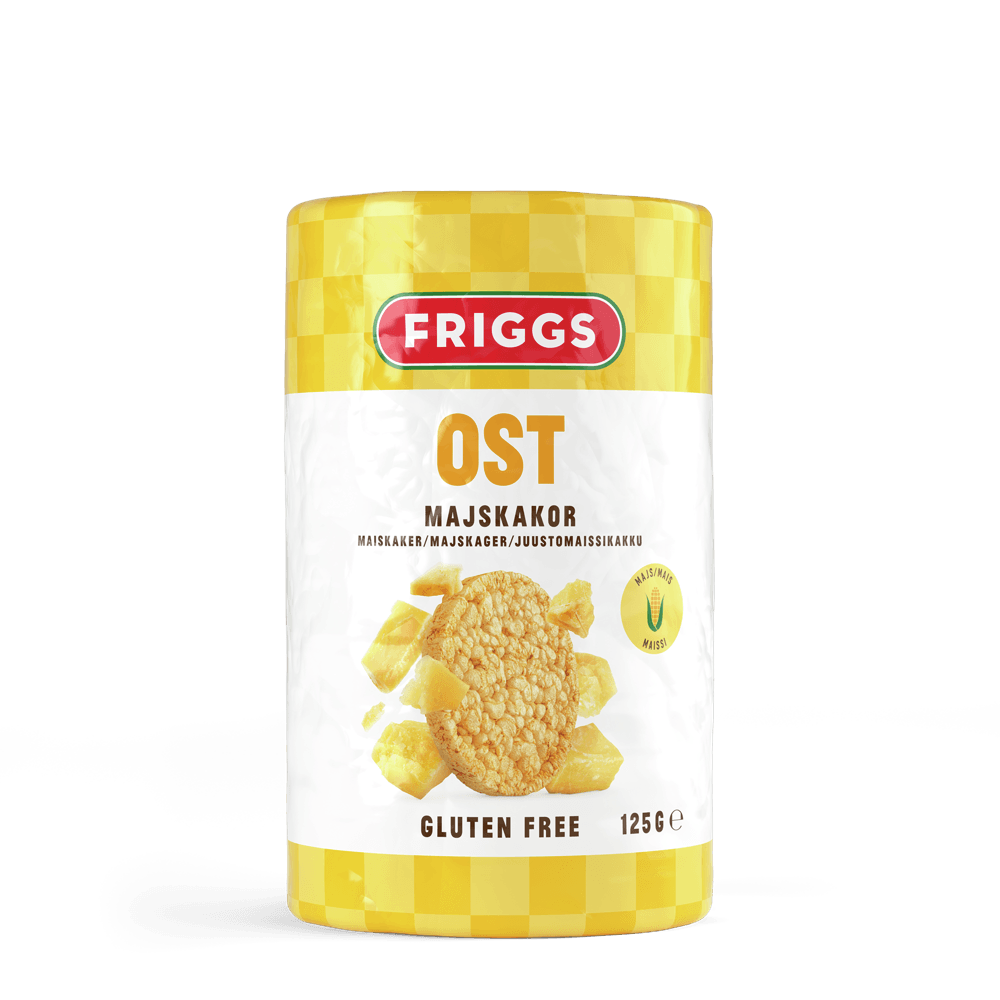 Mais (78%), rapsolje, krydderblanding/krydderiblanding med ostesmak/ smak av ost (9,8%) (mysepulver/vallepulver (fra melk ), ostepulver (13%) (ost, mysepulver/vallepulver (fra melk/mælk)), salt, gjærekstrakt (gjærekstrakt, salt, solsikkeolje) aroma (melk/mælk), surhetsregulerende middel/surhedsregulerendemiddel (melkesyre, kalsiumlaktat), krydderekstrakt/krydderiekstrakt (gurkemeie), fargestoff/farvestof (paprikaekstrakt)). Kan inneholde/indeholde spor av/af soya og sesamfrø.